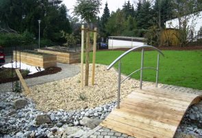 Brücke, Staudenbeet mit Hackschnitzel, Hochbeete aus Lärchenholz,