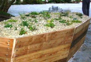 Brücke, Staudenbeet mit Hackschnitzel, Hochbeete aus Lärchenholz,