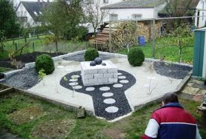 Neugestaltung, Teil eines Gartens mit Wasserspiels
